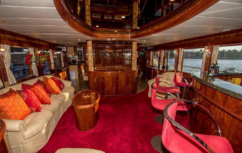 The salon and dining are an open plan with a low island crezenda giving an element of separation. Aft the lounge boasts cream leather soft furnishings, occasional chairs, coffee table and a full wet bar with seating. Panoramic windows give optimum views and ample natural light.