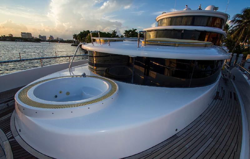 Forward on the main deck the master suite is full beam of the yacht with a center lined king size bed, sofa, vanity, 180 degree views and en-suite facilities with Spa Pool tub.