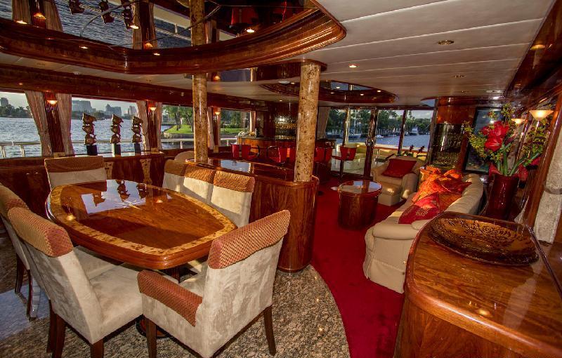 The salon and dining are an open plan with a low island crezenda giving an element of separation. Aft the lounge boasts cream leather soft furnishings, occasional chairs, coffee table and a full wet bar with seating. Panoramic windows give optimum views and ample natural light.