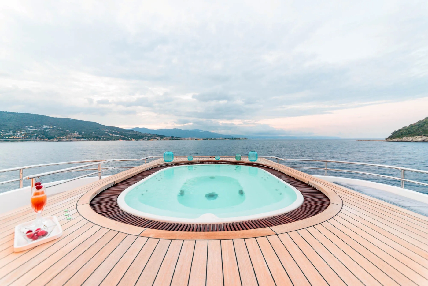 The sun deck is partially enclosed by rounded windows on its forward side and features a lounge on the sunbathing area aft that surrounds a massive rectangular Spa Pool.