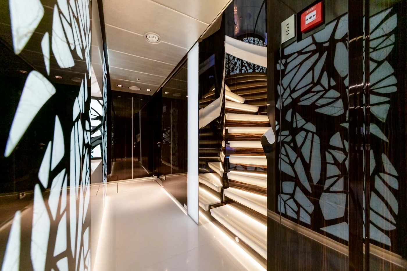 Motor yacht MySky has been superbly designed by Frank Laupman from Omega Architects, with naval architecture by the yard's in-house team, in partnership with Van Oossanen. Her interior design is by Erick van Egeraat. Accommodation is offered for up to 12 guests in 6 cabins.