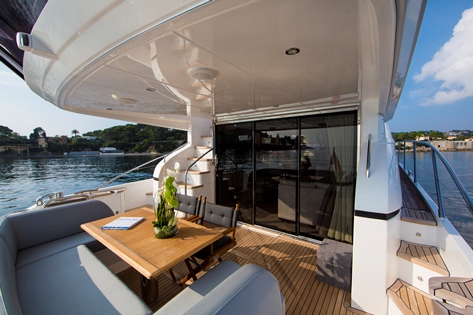Wide sliding glass doors open onto the generous aft deck and shaded alfresco dining option. Forward of the salon, a formal dining table is raised on the port side, with the galley on the starboard. The entire salon and dining ...
