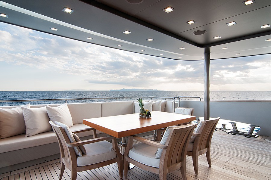 The master stateroom is full beam of the yacht on the main deck forward of the salon, with a king size bed, study, walk in wardrobe, and 2 private balconies. On the lower deck are 2 mirror image VIP cabins and 2 twin cabins, with upper Pullman berths each. An optional queen cabin is located on the upper deck.