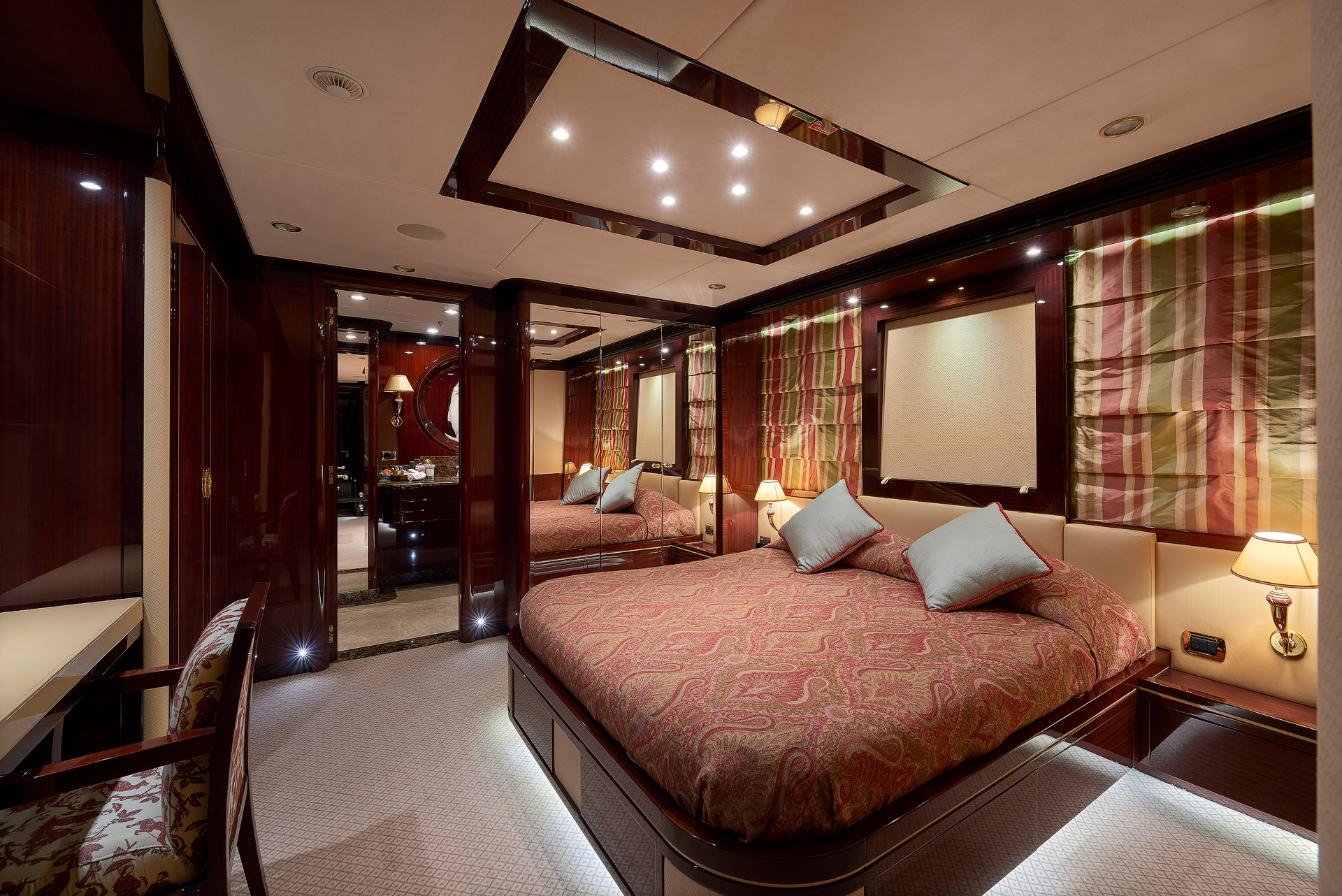The master cabin is truly lavish and located on the upper deck; it boasts a full beam layout, sofa, vanity, large ensuite with his and hers sinks and tub plus a private exterior deck aft.