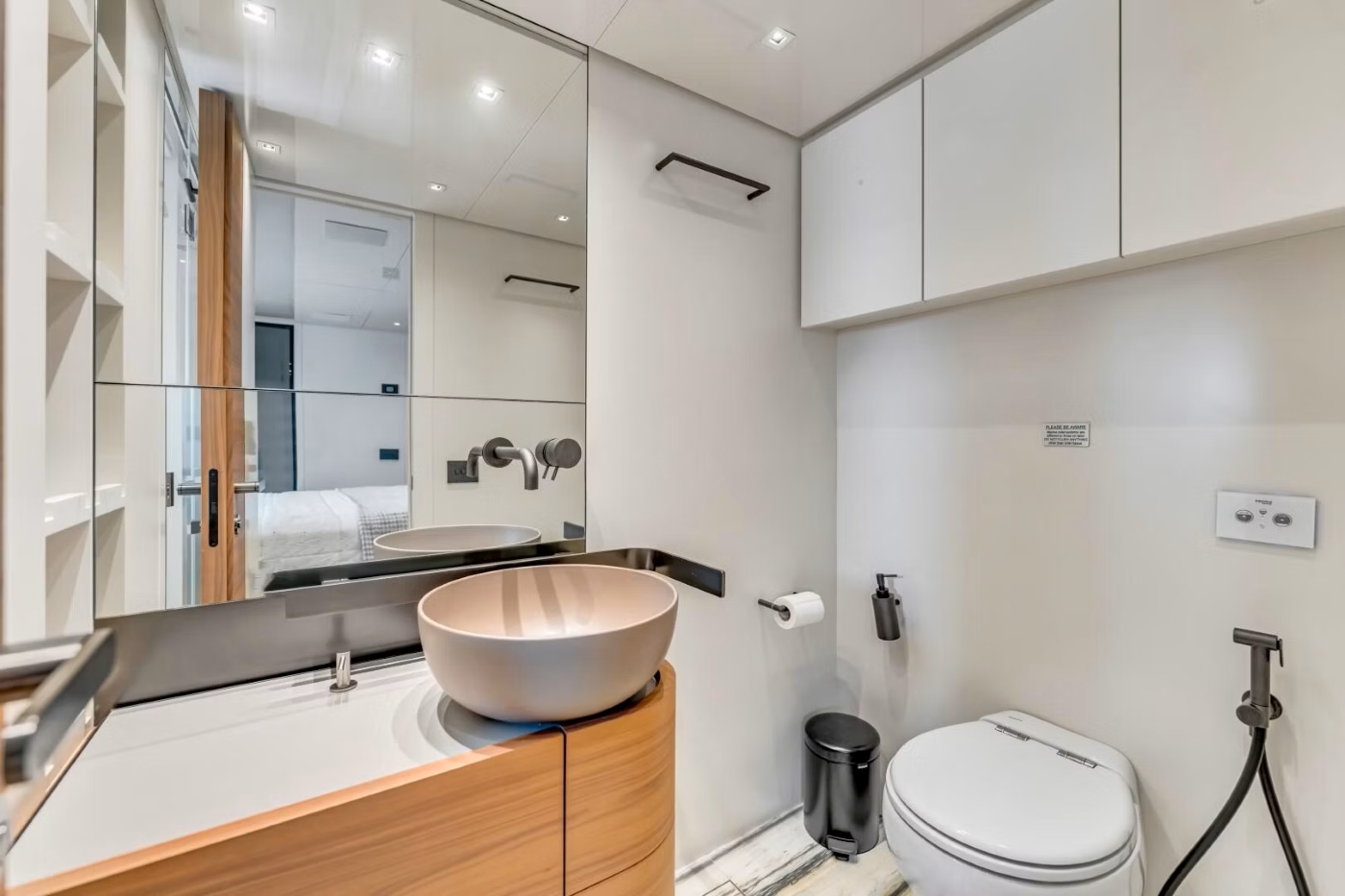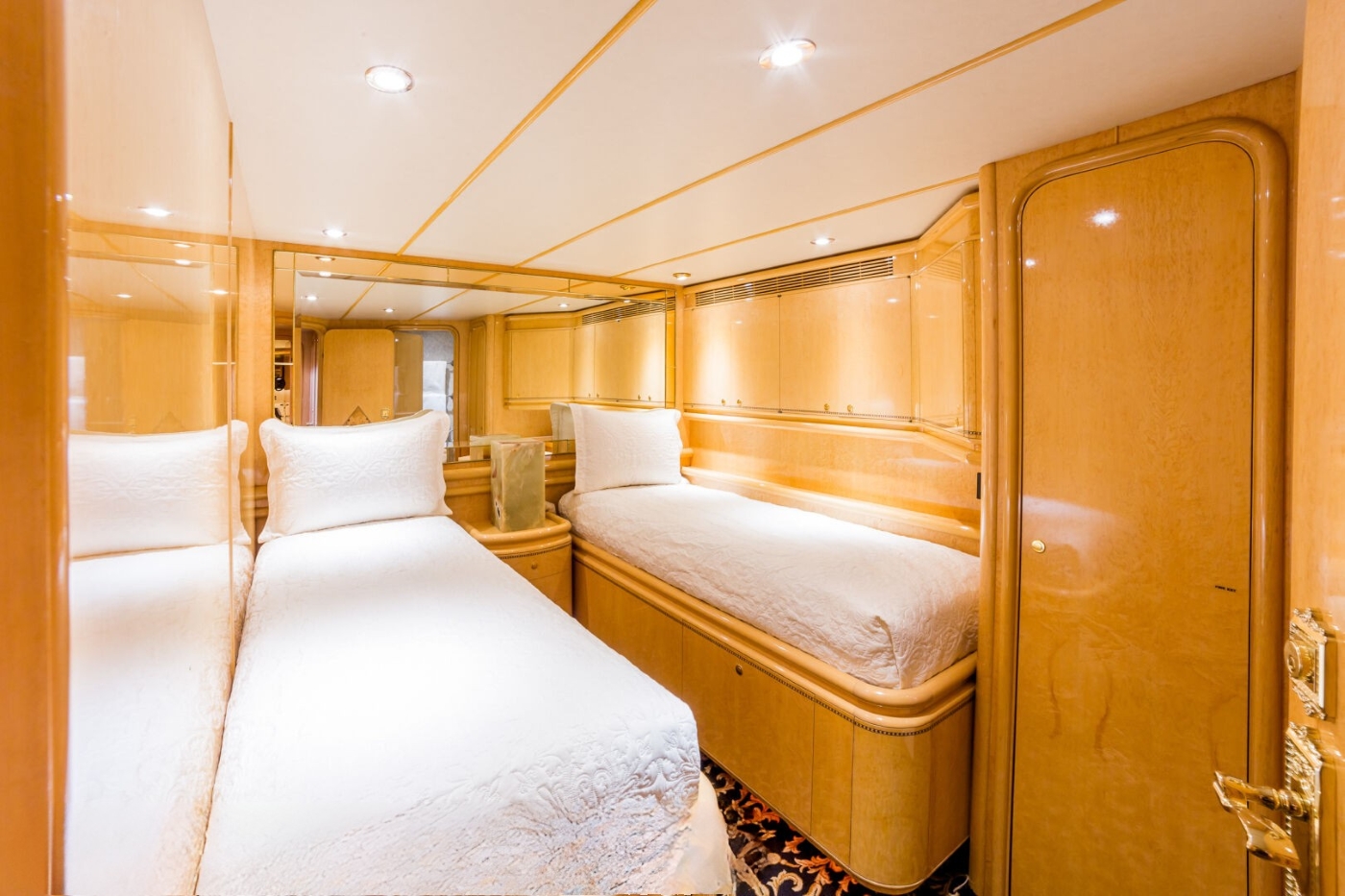 On the main deck forward is the VIP cabin, featuring a full beam layout, private seating area, and generous ensuite.