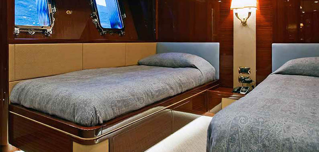 On the main deck forward is the VIP cabin, featuring a full beam layout, private seating area, and generous ensuite.
