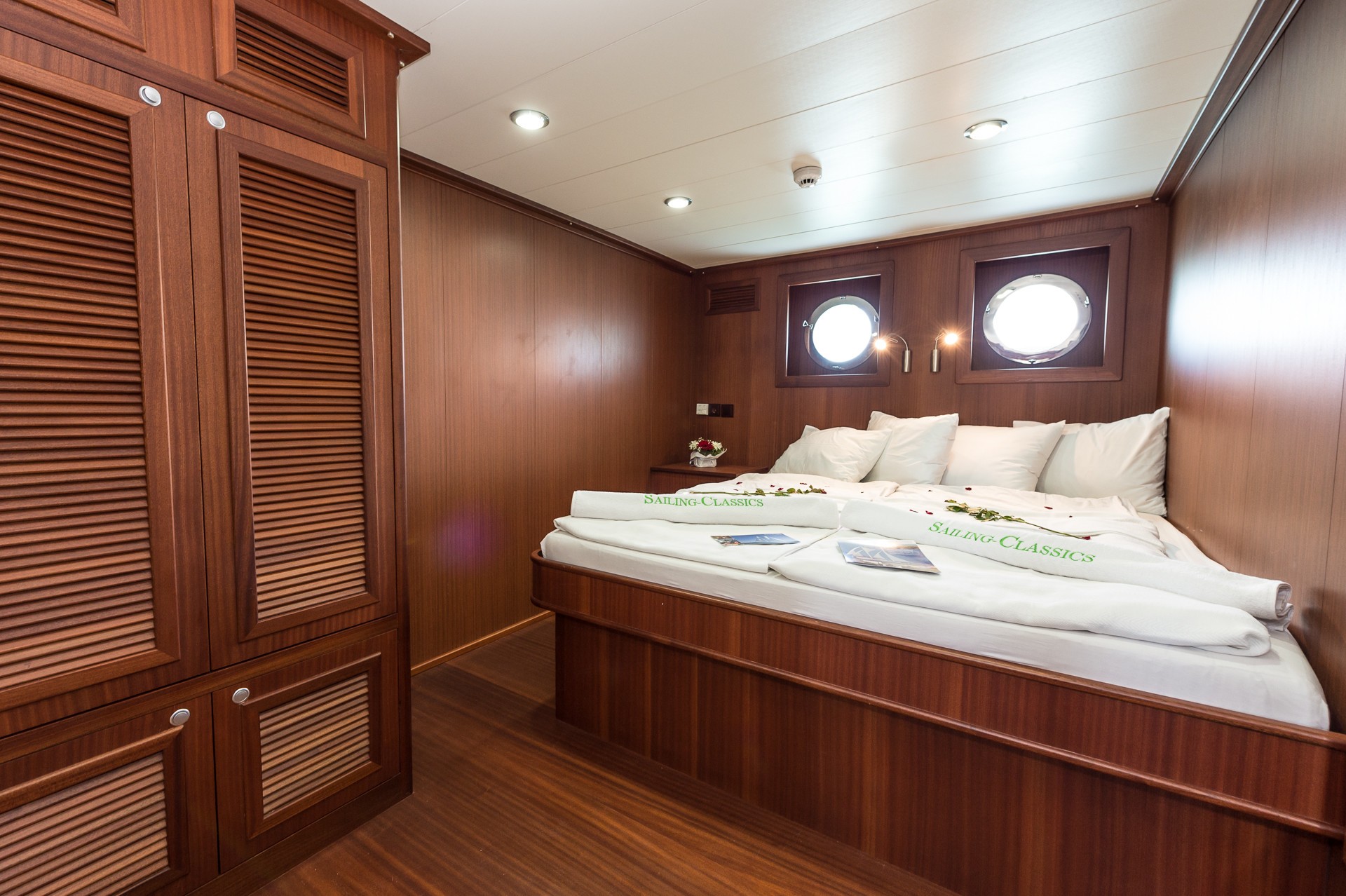 S/Y CHRONOS offers deluxe accommodation for up to 26 guests in 1 master, 10 double and 2 twin cabins, all cabins have en-suite facilities, ports for natural light and individual air conditioning systems. The master suite is aft on the port side with a queen size bed.