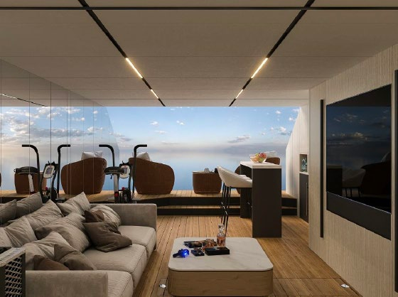 The fold-down beach club is a great place to unwind and is uniquely large for the yacht of this size. This are hide the access stairway and creates a very welcoming area. A large tender is hosted by the yacht's starboard garage.