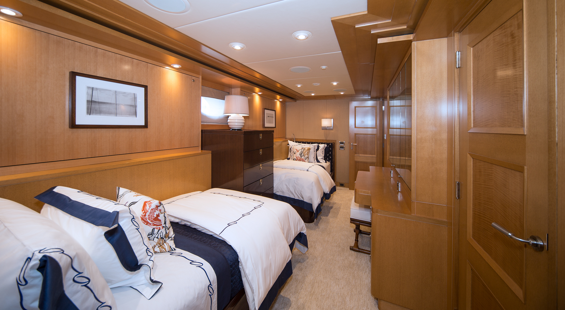 Luxury yacht PALADIN offers accommodation for up to 12 guests in 5 elegant cabins. The master cabin is on the main deck forward and full beam of the yacht with a king size center lined bed, sofa, vanity and deluxe marble en-suite facilities. A further 4 cabins are on the lower deck.
