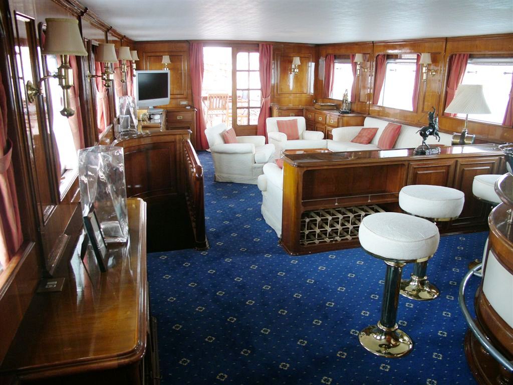The salon is bright and airy featuring warm high gloss wood panels, nautical dark blue carpeting and crisp white soft furnishings, all beautifully accented with natural light provided by the large panoramic windows. A full wet bar is forward of the lounge area complete with fitted bar stools.