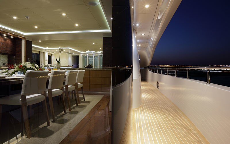 There is also space for the vessel's friendly and dedicated crew of 6 professionals. The aft deck area is utilized as a lifting platform. At deck level, it provides a large area for lounging or entertaining with the tender docked safely out of sight between the hulls.