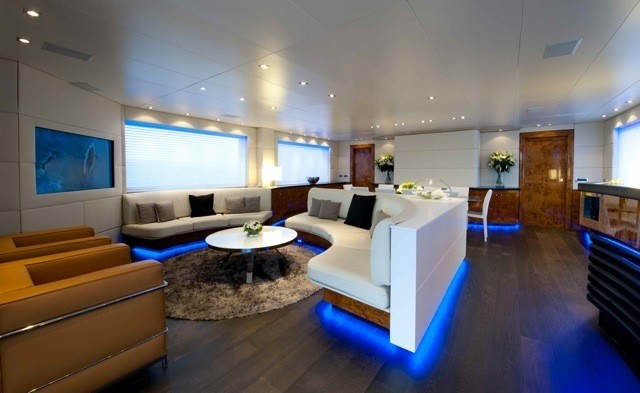 The PALM B motor yacht has a modern contemporary and welcoming interior, with generous spaces to relax. The salon is an open plan featuring dark wood floors, enhanced by light neutral toned panels.