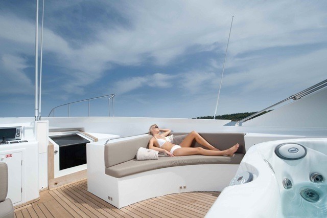 Above the main deck a massive sundeck offers chaise lounges, an alfresco dining option, plenty of additional seating and Spa Pool tub, the sundeck also gives direct access to an elongated custom sun pad on the foredeck, ideal for ...