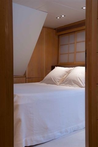 The lounge area is aft offering plush cream leather soft furnishings, a coffee table and built in flat screen TV with entertainment system. Guests can enjoy an aperitif at the stylish black marble wet bar adjacent to the lounge. Forward of the salon is a unique white formal dining table, flanked by chic leather chairs.