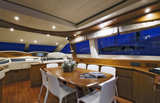 Charter Yacht FORZA 8 boasts alfresco dining on her aft deck with optional shade, for the sun worshipers a triple sunpad lays just beyond.