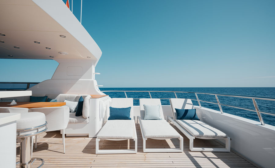 This outdoor space places a sumptuous sofa along the stern with a table for dining alfresco, and a stairway goes down both sides to the lower deck swim platform for sunbathing beside the water and access to the tender and large ...