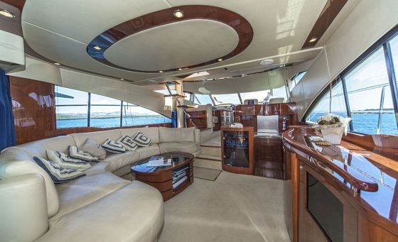 She accommodates 6 guests in two Master cabins, and one twin cabin, she is fully air conditioned, with LCD TV/DVD in salon and twin cabin and Sony surround sound system throughout including flybridge and cockpit.