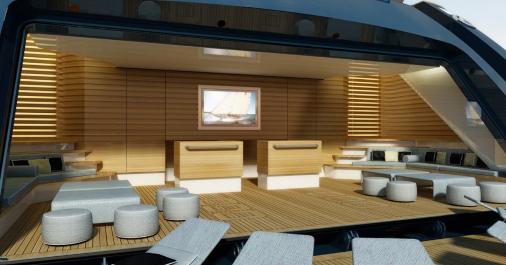 The bridge deck hosts the larger motorised water toys and the sundeck hosts a marvellous central swimming pool with room to the aft for sunbathing and observation.