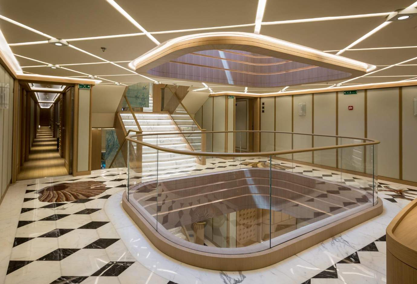 Precious white marble, tay wood and fabric panelling, as well as leather frames, create an elegant and pale environment that emphasises the already voluminous interiors.
