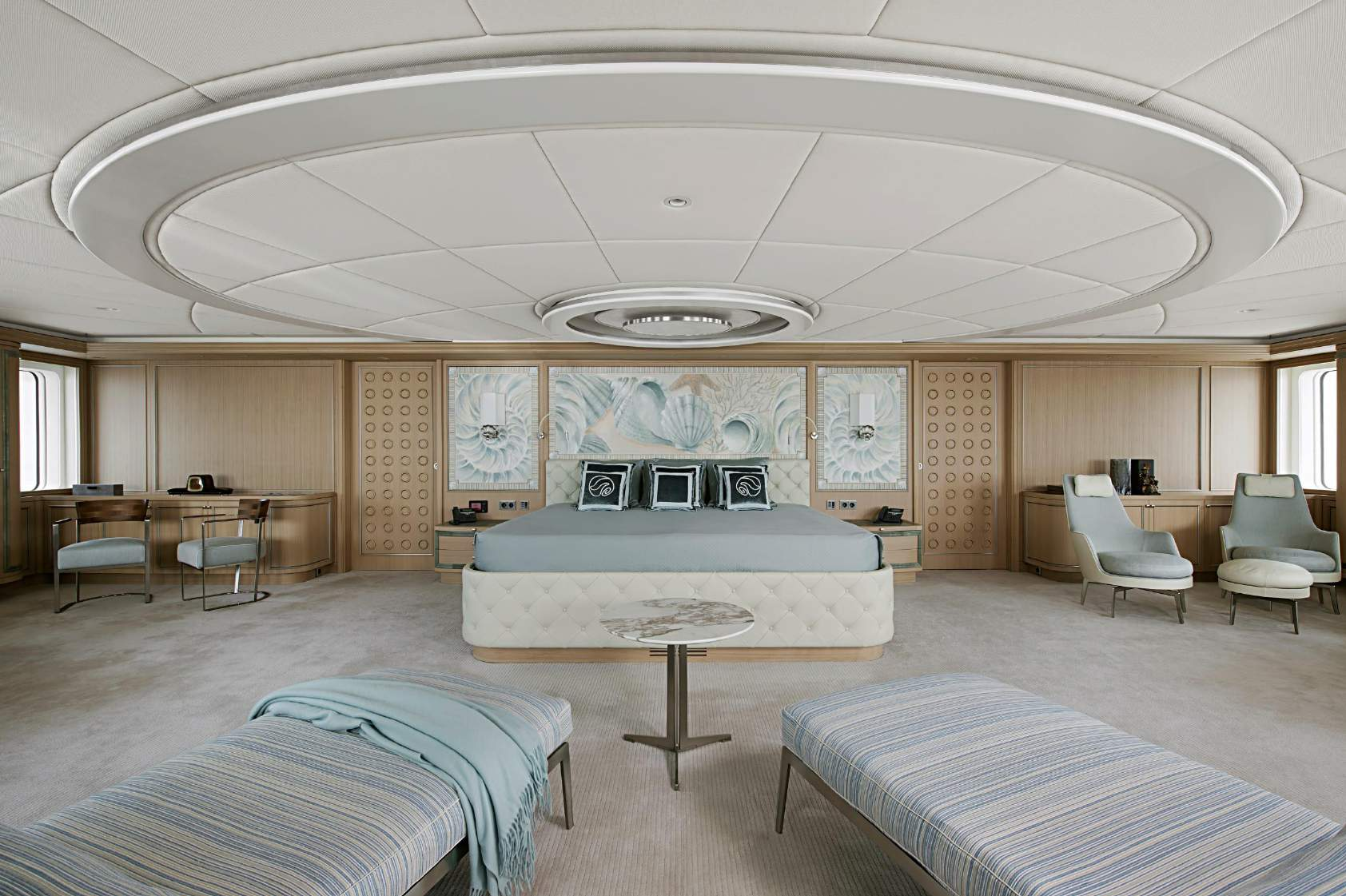 Precious white marble, tay wood and fabric panelling, as well as leather frames, create an elegant and pale environment that emphasises the already voluminous interiors.