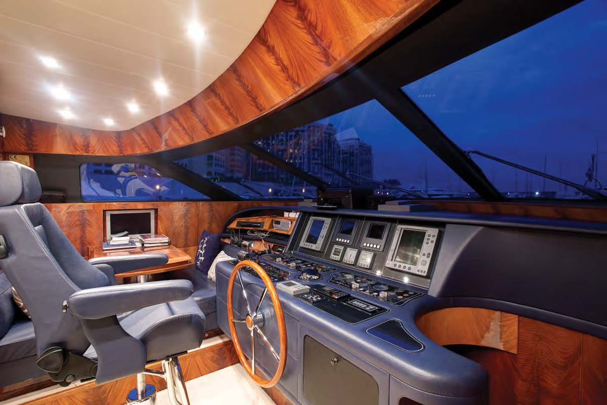 Above deck, the flybridge is perfect for sunning and entertaining, complete with a large convertible sun pad to Spa Pool tub, alfresco dining option, additional lounge seating and wet bar/BBQ station.