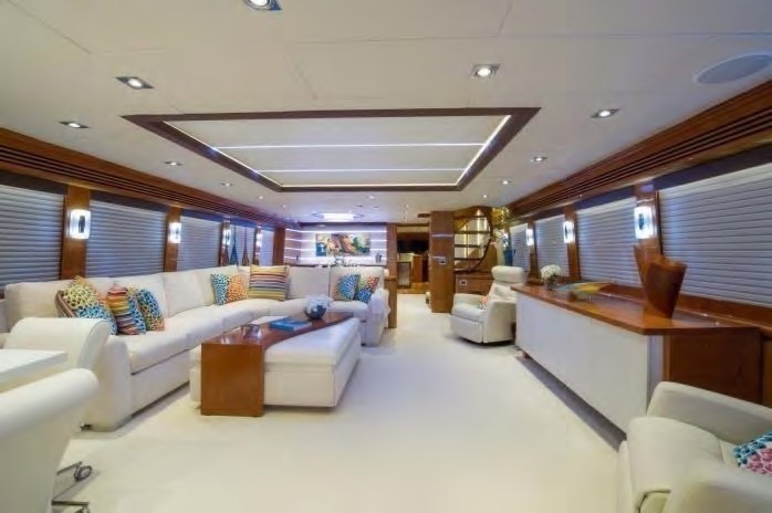 The master suite is amidships and full beam of the yacht, with a king size bed, seating, vanity and en-suite with tub. The VIP and guest double cabin each have a queen size bed. A further guest cabin offers side by side twin beds. All 4 cabins are light and airy and boast a modern elegant theme, creating a truly soothing ambiance.