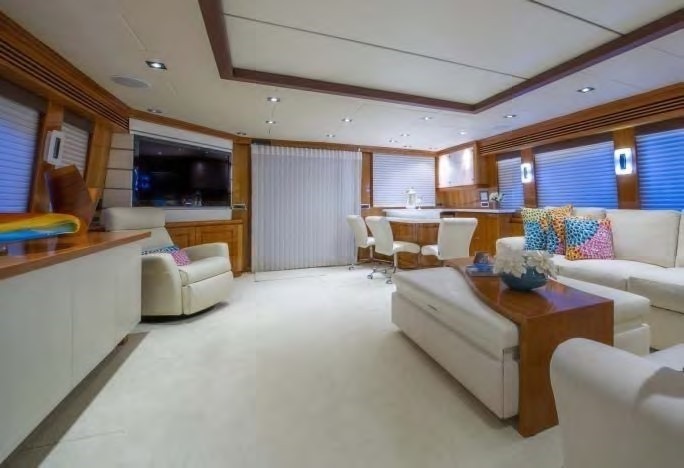 Aft of the salon, wide doors open onto a shaded deck, offering an alfresco dining option, bar service area and drop down TV. Active guests will find the extended swim platform, with stainless steel hand rails, perfect to make the most of the water toys on offer.