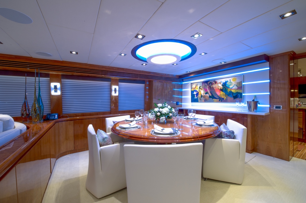The salon and dining is an open plan, offering a spacious lounge aft, with a large L shaped sofa, seating, coffee table and ottoman. Forward, a low island credenza provides a casual separation to the stylish formal dining area.