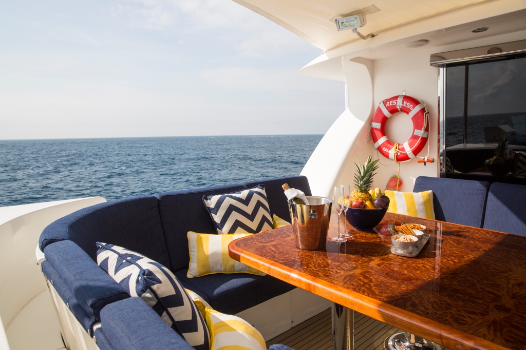 A luxury crewed yacht charter aboard the Hargrave motor yacht OSSUM DREAM, is ideal for the balmy Mediterranean, thanks to her ample exterior living. Aft of the salon, wide doors open onto a shaded deck, offering an alfresco dining option, bar service area and drop down TV.