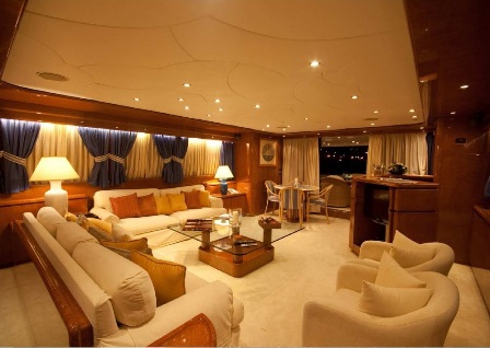 The salon is ideal for relaxing or entertaining, featuring two large sofas and 2 occasional chairs which surround a clear glass coffee table. Aft of the lounge area and on port is a complete wet bar with a cocktail / games table to starboard. A day head is forward of the salon.