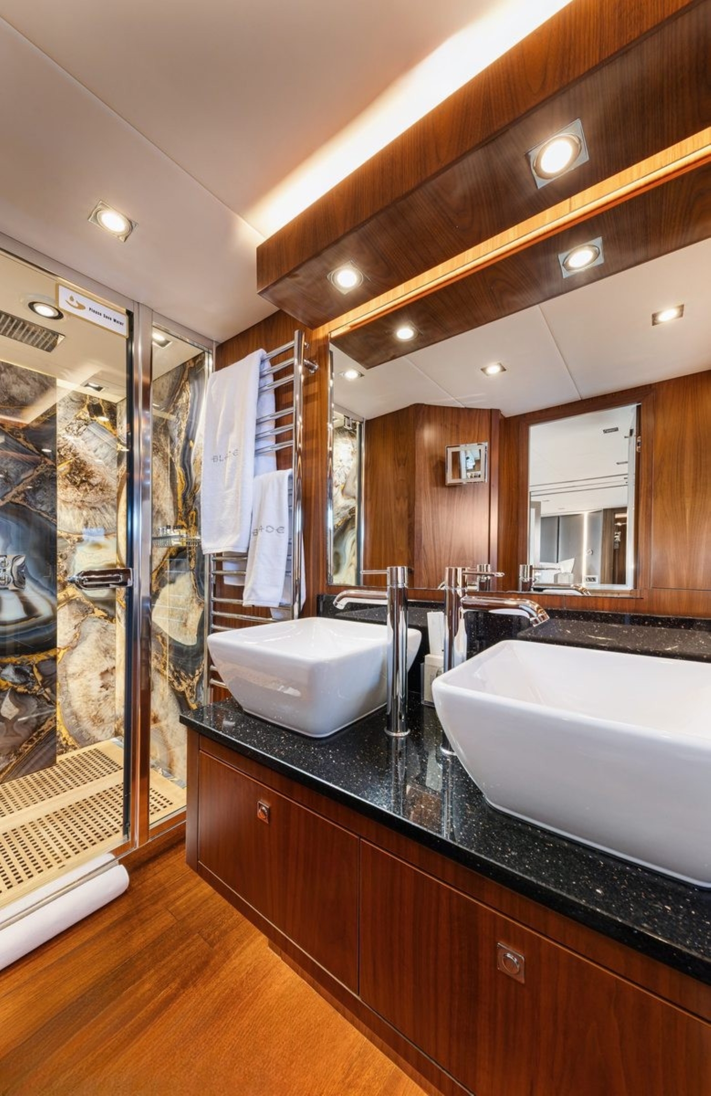 The salon and dining are an open plan. The lounge area is aft featuring a generous U shaped crisp white sofa and coffee table to port, with entertainment to starboard. Forward of the lounge the formal dining table seats 8 guests comfortably.