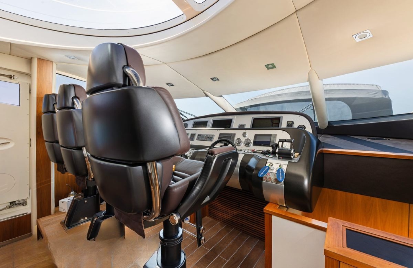 The salon and dining are an open plan. The lounge area is aft featuring a generous U shaped crisp white sofa and coffee table to port, with entertainment to starboard. Forward of the lounge the formal dining table seats 8 guests comfortably.