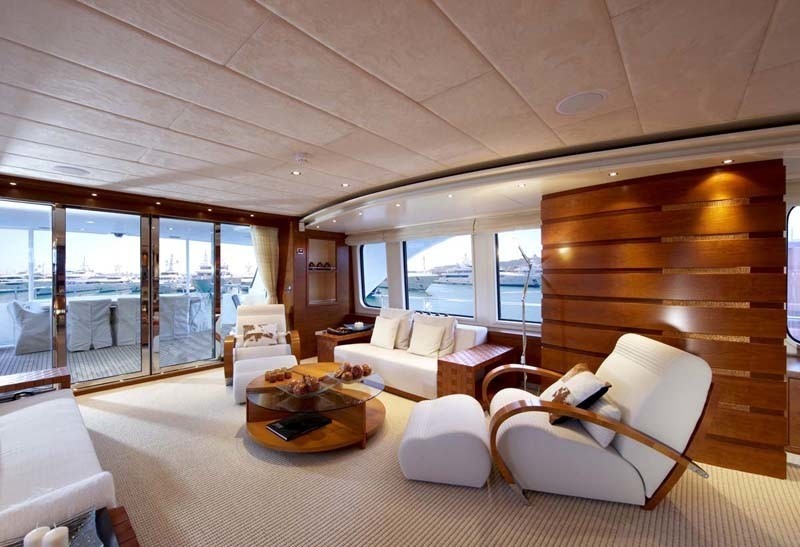 The dining area seats 10 guests in luxuious envitonment. The lower deck hosts all guest cabins, including a full-beam master suite.