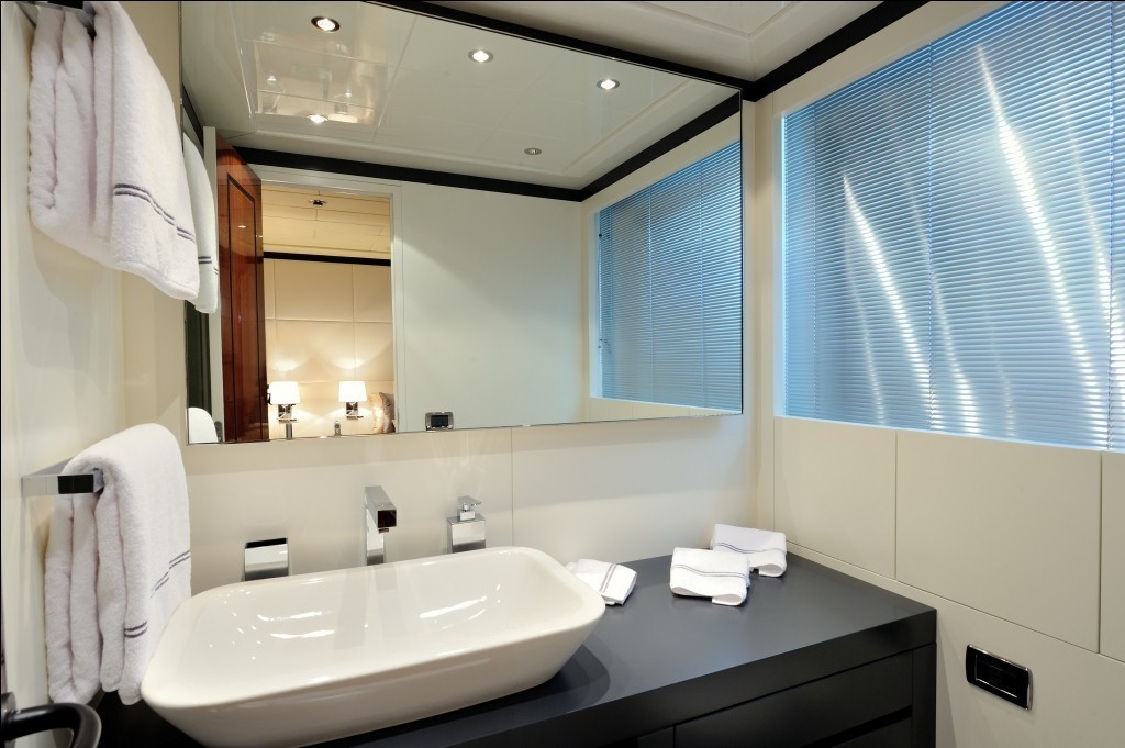 Her main salon is bright and spacious with a hidden bar, comfortable couches to port with an entertainment system to starboard. Further forward is the formal dining table and beyond is the triple chair helm station.
