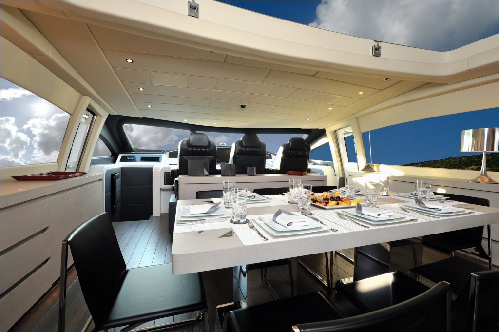 Further forward is the formal dining table and beyond is the triple chair helm station. The main salon also has a retractable roof, allowing natural light, a warm breeze, the sun or the stars to be enjoyed from inside the yacht.