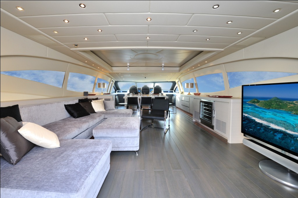 This lovely yacht has a beautiful aft deck with ample sunbeds, covered by umbrellas and a dining table for eight guests. Her bow has a vast sunbathing area covered by a bimini for privacy and a cover from the midday sun.