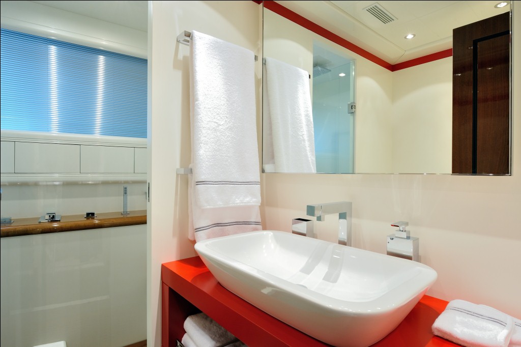Further forward is the formal dining table and beyond is the triple chair helm station. The main salon also has a retractable roof, allowing natural light, a warm breeze, the sun or the stars to be enjoyed from inside the yacht.