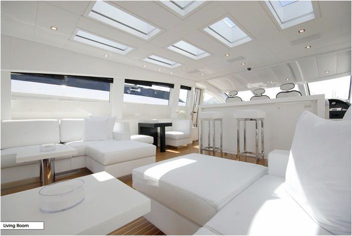 FRIDAY’s main salon has large white couches to port and starboard providing comfortable lounging for all guests onboard.