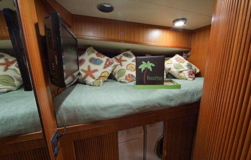 The salon and dining are an open plan with the lounge area aft, offering a large sofa, coffee table, 2 occasional chairs and a full entertainment center. Forward, the formal dining table seats guests in style, perfectly chilled wines are available from the adjacent wine fridge.