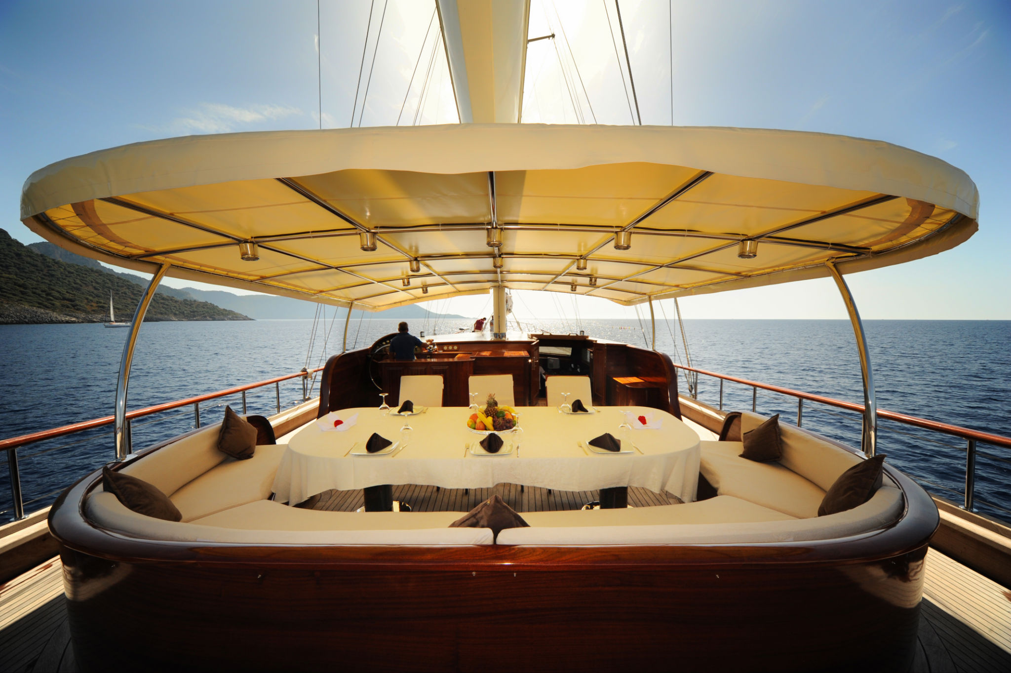 The gulet has plenty of teak deck areas to enjoy the East Mediterranean’s warm weather. The aft deck is shaded offering a large alfresco dining option, further aft a traditional gulet full beam sunpad is ideal to catch a tan or simply relax.