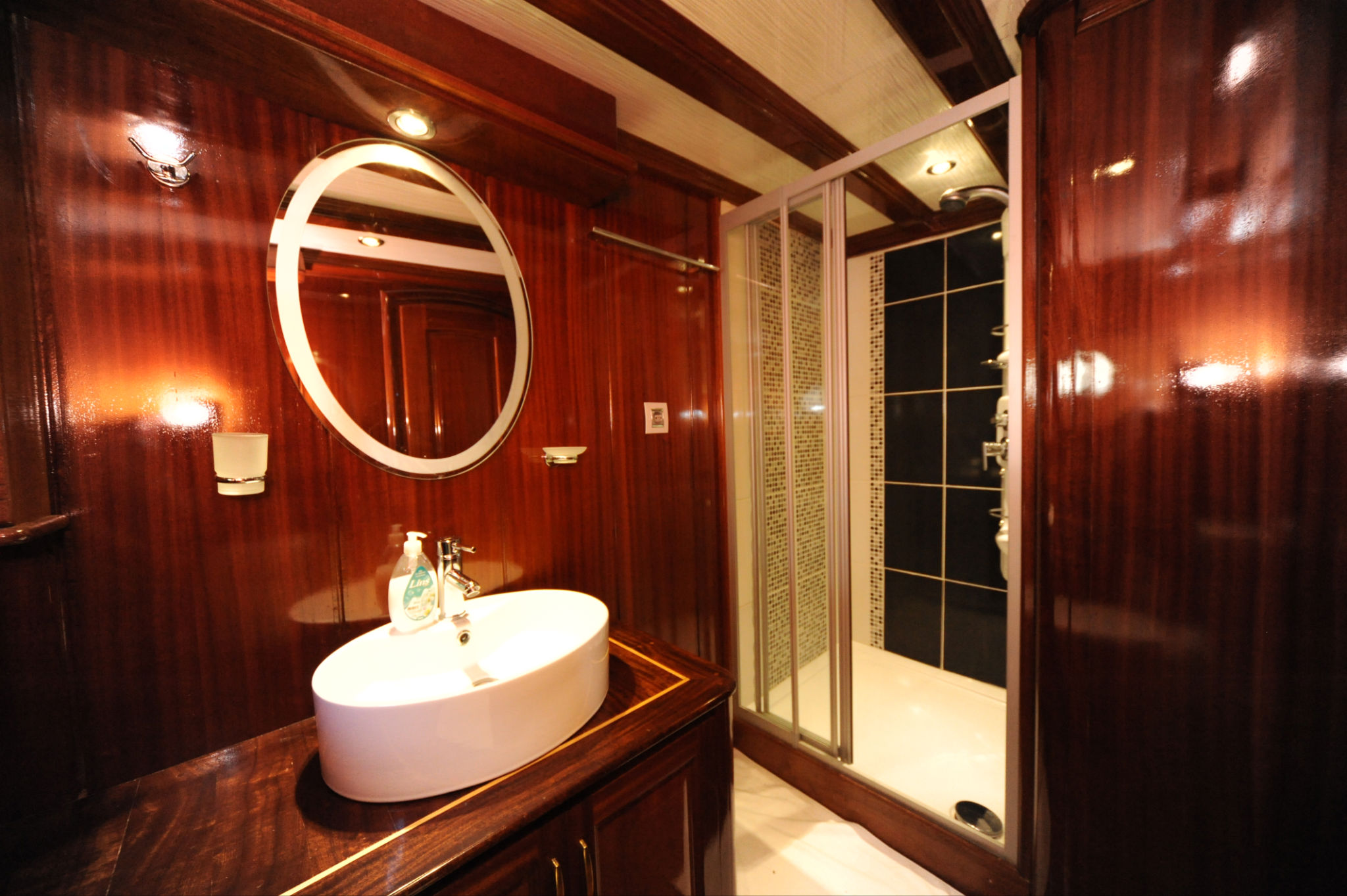 The salon is spacious and refined, with surrounding windows allowing ample natural light. A formal dining area and large custom built U shaped sofa are on the port side, with a wet bar to starboard. Above, the deck head features plush suede adding a glamorous feel.
