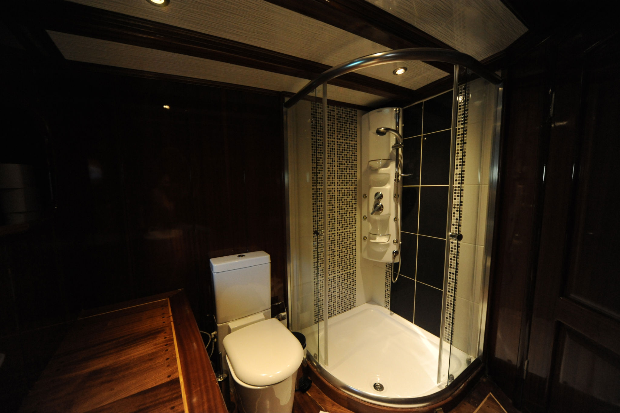 The salon is spacious and refined, with surrounding windows allowing ample natural light. A formal dining area and large custom built U shaped sofa are on the port side, with a wet bar to starboard. Above, the deck head features plush suede adding a glamorous feel.