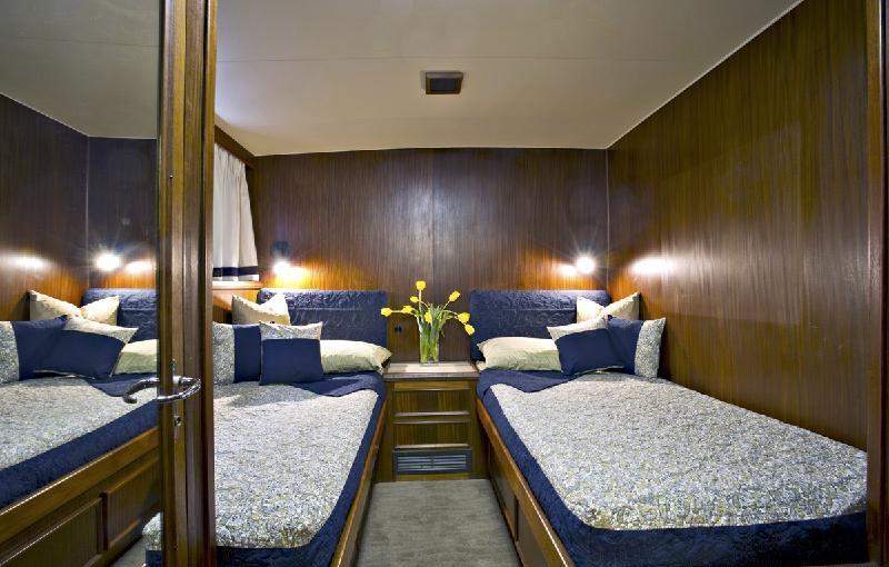 The VIAGGIO motor yacht can accommodate up to 6 charter guests in 3 spacious cabins. The master suite is amidships and full beam of the yacht with a center lined queen size bed, cedar lined closet, vanity and en-suite with bath tub.