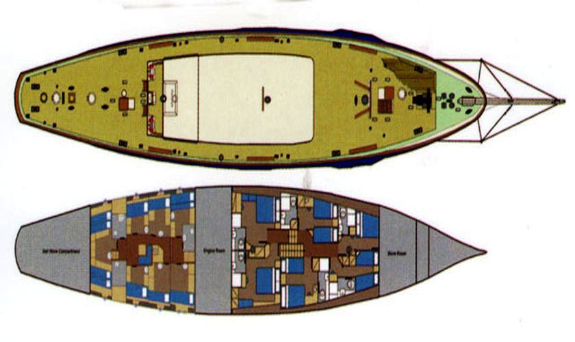 A master and VIP cabin offer queen size beds amidships on port and starboard, 2 double guests cabins have double beds, one with a Pullman berth and a further 2 cabins offer twin beds each. One of the twin cabins can be adjoined to a double cabin if required.