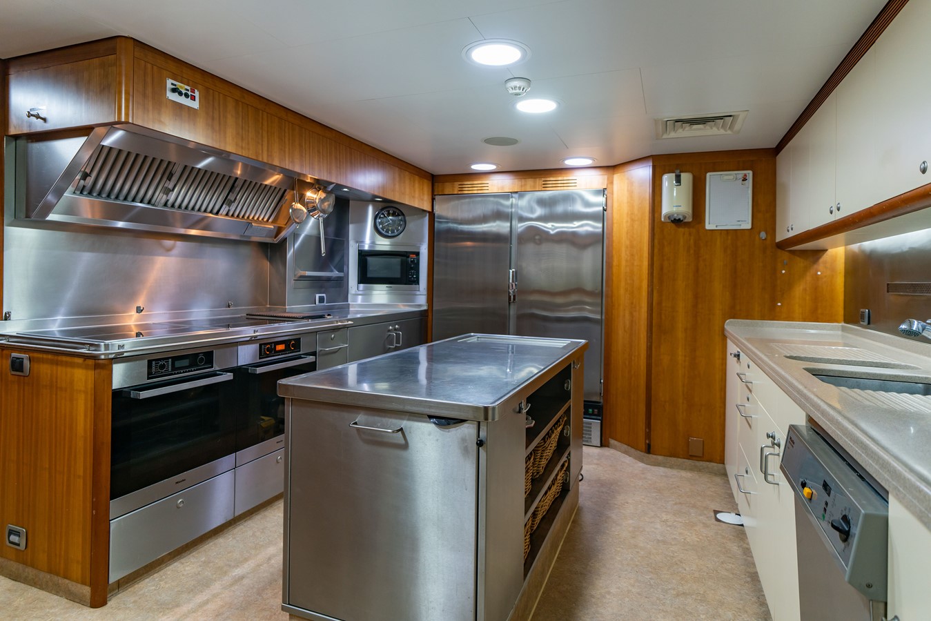 The main deck accommodates the main lounge, the dining room aft, the galley and lastly the owner's suite, while the upper deck hosts the TV saloon and the captain’s stateroom, an office and her pilothouse.
