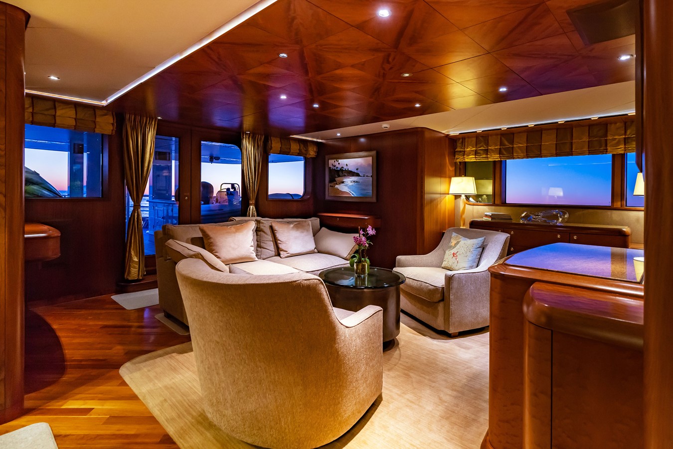 The main deck accommodates the main lounge, the dining room aft, the galley and lastly the owner's suite, while the upper deck hosts the TV saloon and the captain’s stateroom, an office and her pilothouse.