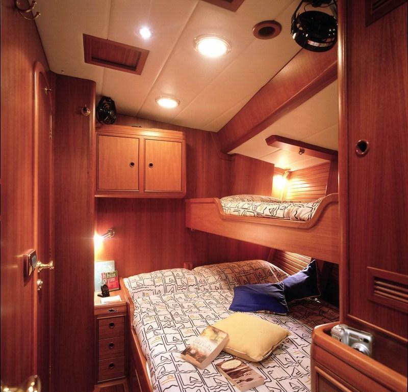 Eight to nine guests are accommodated in 2 double cabins aft and 1 double and 1 twin cabin forward.
