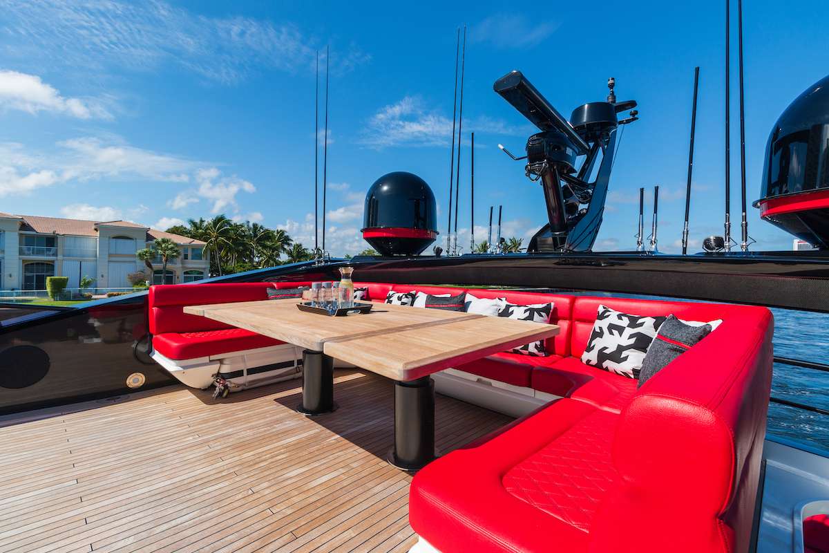 The main deck features a large lounge settee, as well as a dining table that is situated behind the central three seat helm station.