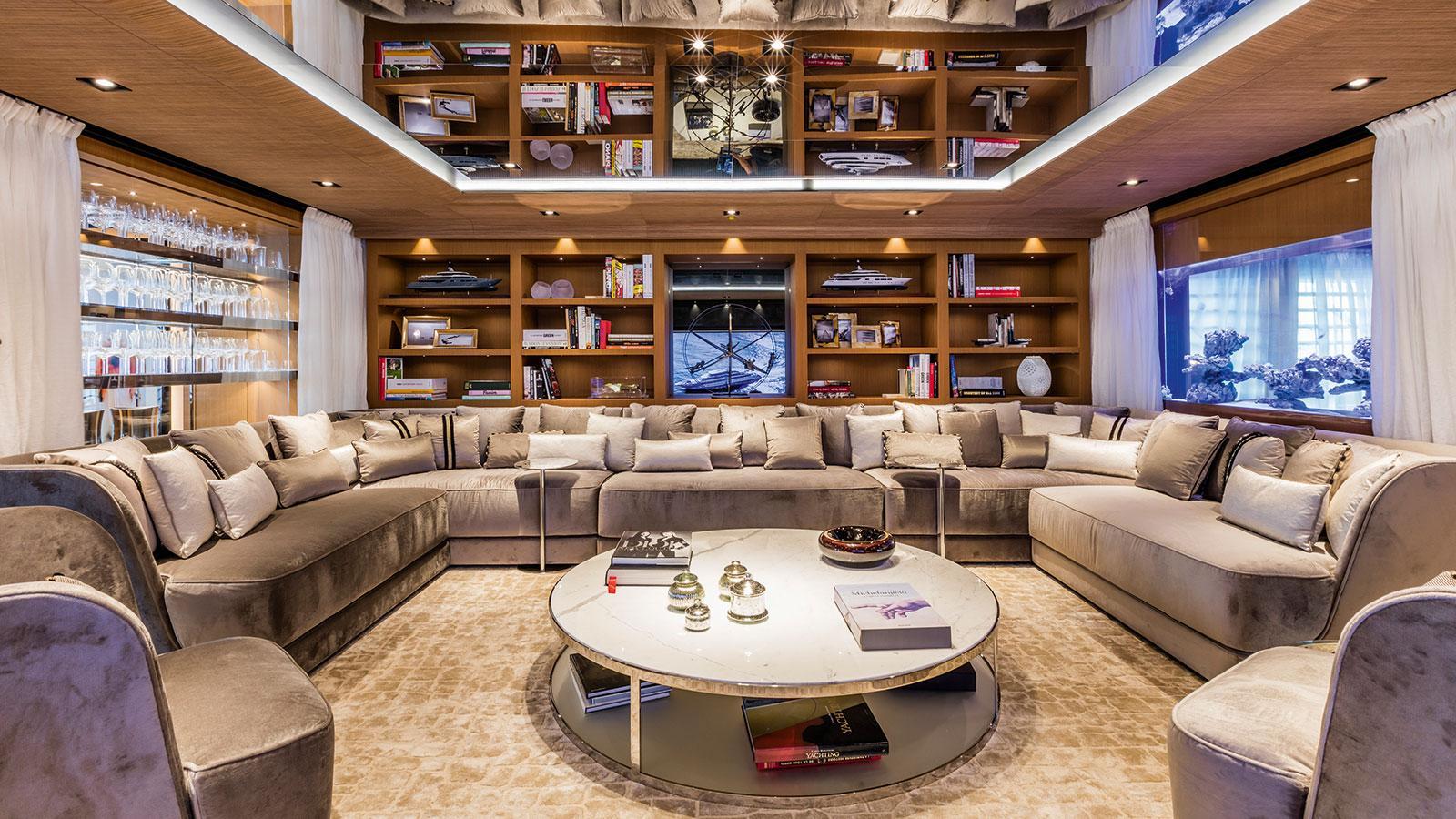 Her exterior is elegant and modern, with curved and clear lines. The sun deck has a huge swimming pool with glass bottom and waterfall, bar and lounging area. It also boasts a touch and go helipad that converts to a dance floor, complete with DJ mixing desk and strobe lighting.