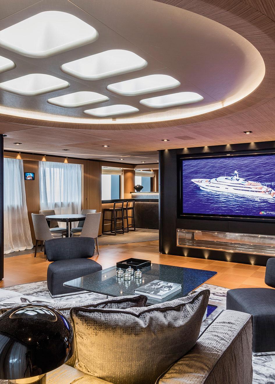 Instead of the usual salon, she boasts a large lobby with sofas and coffee tables leading to a TV room/Cinema. The large Aquarium acts as a divider between this room and the dining room. A large sky lounge with ensuite converts to a double cabin.
